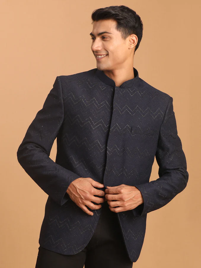 Navy Blue color glitter work zig zag pattern smart looking bandhgala jodhpur, has a mandarin collar, full sleeves, a welt pocket with pocket square .